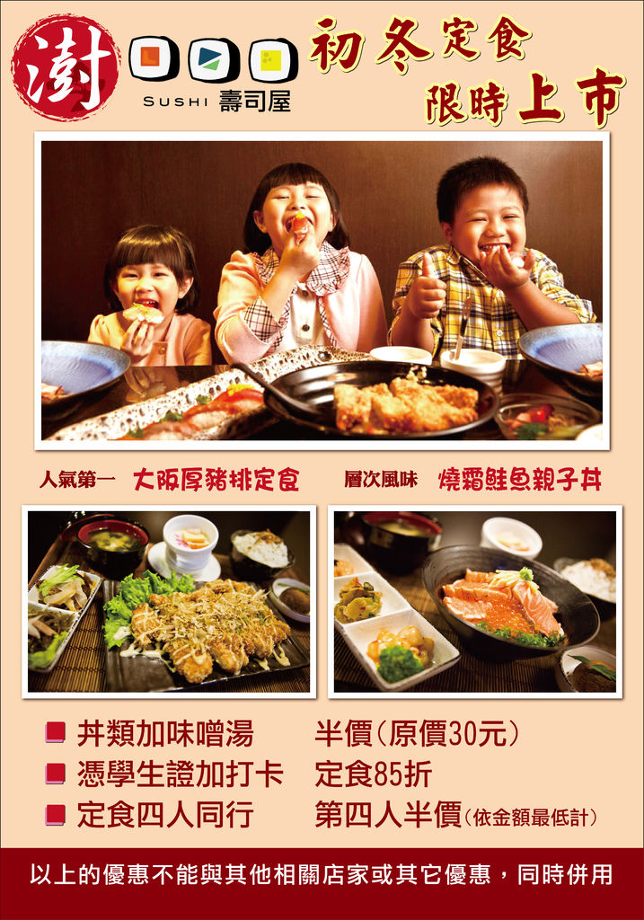 澍壽司屋開放特約廠商加入, 加入特約享去成優惠, 並隨時提供店面新活動. 請連結以下網址, http://goo.gl/eYMd7 填好資料附上公司名片, 郵寄至:330桃園市復興路270號 店長yuri收 歡迎加入澍壽司屋粉絲團: https://www.facebook.co...