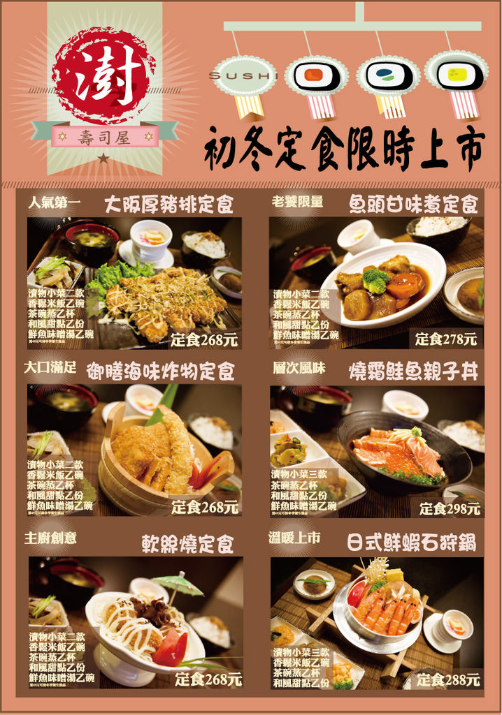 長達半年的策劃,澍壽司屋終於誔生 位在桃園市復興路270號,新光大樓斜對面 菜單部份